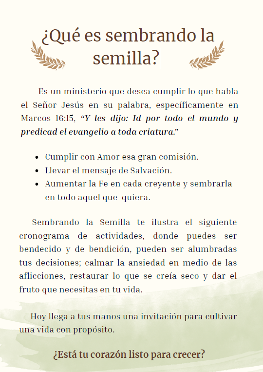 El Ministerio Sembrando la Semilla, nace el 20 Julio 2017 por un grupo de hermanas, dirigidas por la hermana Rachel Codina, en el Estado de Indianápolis, Estados Unidos. El Ministerio ha estado enfocado en cumplir la gran comisión, de llevar el mensaje de salvación, partiendo en una forma local, expandiéndose internacionalmente a través de la redes sociales y también por su radio online, con presencia mundial.
